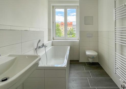 - stilvoll modernisiertes Familienbad mit Badewanne und geschmackvoller Fliesengestaltung