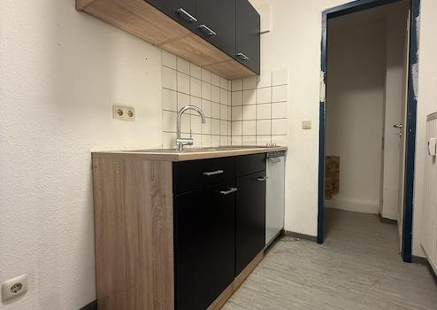 Die bauliche Trennung zwischen Wohn- und Schlafbereich verleiht der Ein-Zimmer-Wohnung einen attraktiven Zwei-Zimmer-Charakter und sorgt für eine klare, angenehme Raumstruktur. Die weiß gehaltenen Wände schaffen eine helle, zeitlose Wohnatmosphäre. Ein besonderes Highlight der Wohnung ist die neue Einbauküche, die sich modern und funktional in den Wohnbereich einfügt.