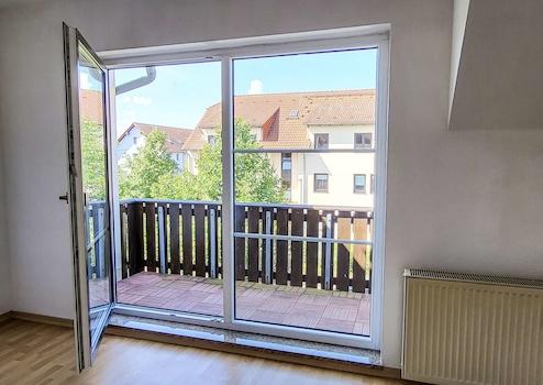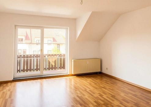 Das nach Süden ausgerichtete Wohnzimmer bietet direkten Zugang zum Balkon und eröffnet einen angenehmen Weitblick über das Wohnareal bis in Richtung Wurzen.