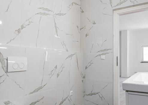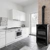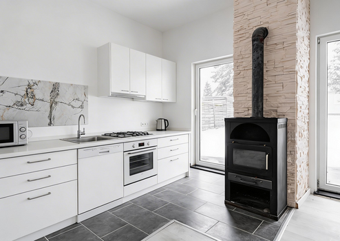 Küchenbereich mit Fliesenspiegel aus großformatigen Marmorplatten