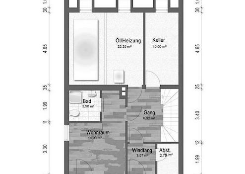 Separate Eingangstür, Wohnraum (15 m²), Badezimmer, Abstellraum, Gang, Kellerraum, Heiz- und Waschraum sowie Raum für den Öl-Stahltank (7.000l).