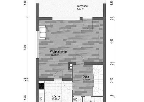 Diele, Badezimmer mit Dusche, separates WC, Küche, Wohn-/Esszimmer (39 m²), Terrasse (23 m²) mit Süd-Ost-Ausrichtung.