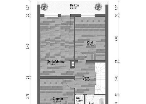 Raumaufteilung siehe Grundrisse. Flächen der Terrasse und des Balkons sind zu einem Viertel in der Wfl. berücksichtigt.