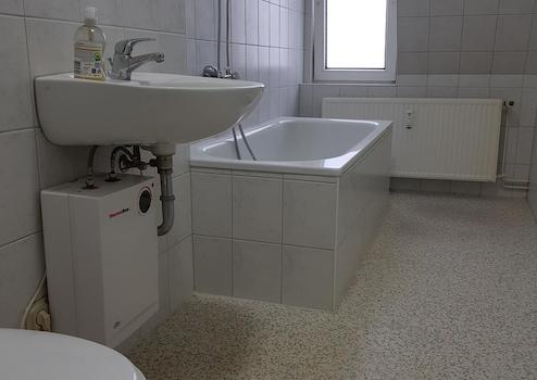 Das helle, geflieste Badezimmer mit Badewanne lädt nach einem langen Arbeitstag zum Entspannen ein. In der Küche mit praktischer Küchenzeile kann gemeinsam gekocht werden – kompakt, funktional und gemütlich zugleich.