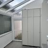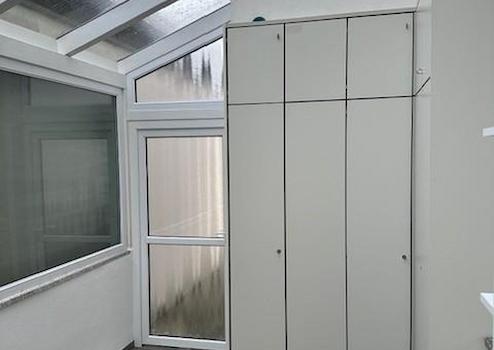 Direkter Zugang über Wohnbereich = verglaster Anbau / Stuhllager -Lagerfläche mit deckenhohen Einbauschränken für diverse Staumöglichkeiten.