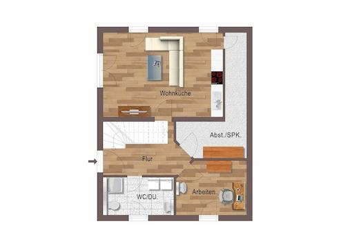 Das Herzstück des Hauses bildet der offen gestaltete Wohn- und Kochbereich, der durch seine Großzügigkeit und den integrierten Kamin eine besonders einladende Atmosphäre schafft. Hier verbinden sich Kochen, Leben und Zusammensein auf angenehme Weise. Die vorhandene Einbauküche fügt sich funktional in das Raumkonzept ein und ermöglicht einen direkten Einzug ohne zusätzlichen Aufwand.