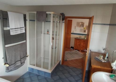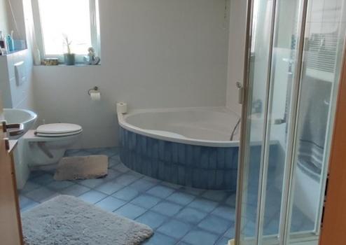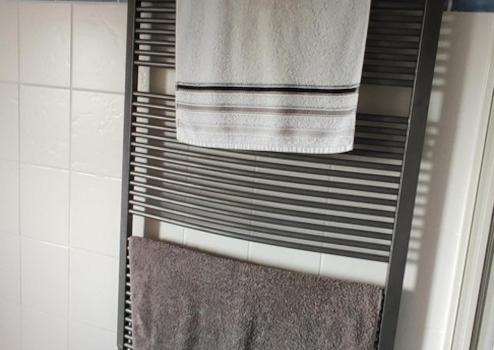 Das Bad hat eine Fußbodenheizung (Fußbodentemperierung über ein RTL-Ventil) und zusätzlich einen Heizkörper zum Trocknen von Handtüchern.