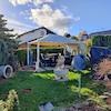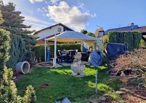 Das Grundstück selbst wurde vom Eigentümer liebevoll angelegt und gestaltet. So wurden z.B. diverse Dekoelemente auf den Grünflächen verteilt. Büsche, Sträucher und eine Hecke als Sichtschutz sind ebenfalls vorhanden. Außerdem befindet sich im Garten ein Freisitz, der von einem Pavillon überdacht ist.