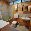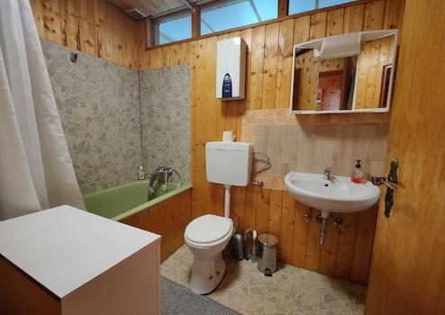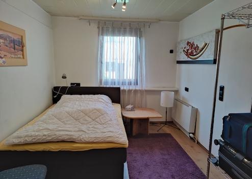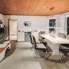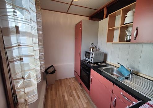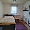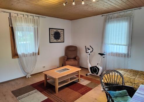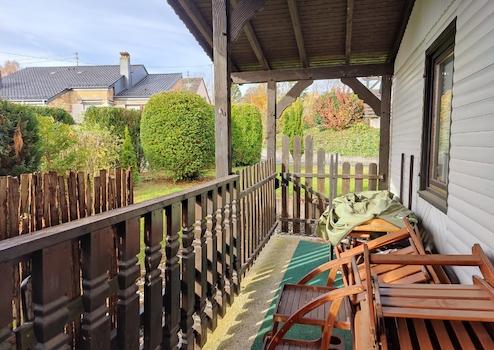 Das Holzhaus steht derzeit leer. Es verfügt über 2 Zimmer und eine große überdachte Terrasse. Bei Bedarf können beide Häuser über einen Durchgang wieder miteinander verbunden werden. Der barrierefrei gestaltete Bungalow kann als Gäste- oder Ferienhaus dienen.