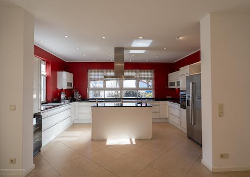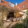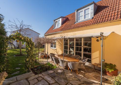 Die moderne U-förmige Einbauküche mit Kochinsel in Weiß fügt sich harmonisch ins Raumkonzept ein. Sie ist mit hochwertigen Markengeräten wie einem Induktionskochfeld und einem Weinkühlschrank ausgestattet und lädt zu geselligen Kochabenden ein. Die Terrasse, süd-westlich ausgerichtet und mit italienischen Steinfliesen bedeckt, bietet Platz für ungestörte Stunden im Freien. Umrahmt von einer überdachten Pergola, gepflegten Obstbäumen und einer großzügigen Rasenfläche ist der Garten ein wahres Paradies.