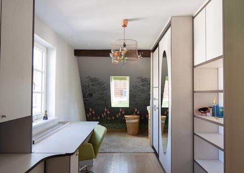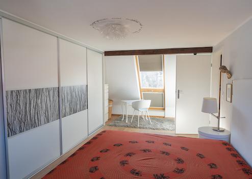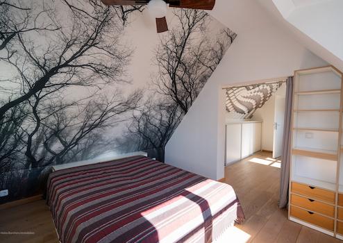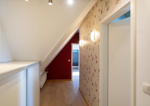 Eine elegante Holztreppe führt Sie ins Obergeschoss, wo das Schlafzimmer mit ausklappbarem Velux-Dachbalkon und ein großes Badezimmer auf Sie warten. Der angrenzende Flur führt zu einem weiteren Bad und zwei gemütlichen Kinderzimmern. Der Dachboden bietet Ihnen weiteren Stauraum. Er ist über eine ausziehbare Leiter zugänglich.