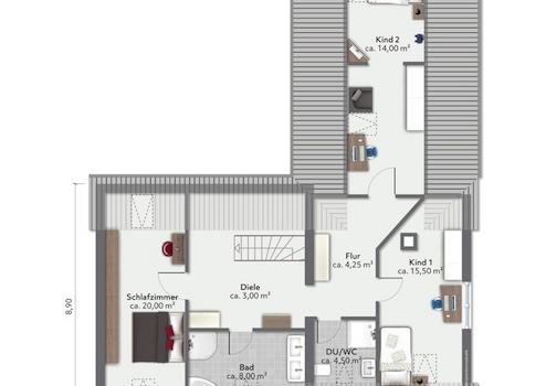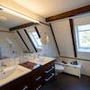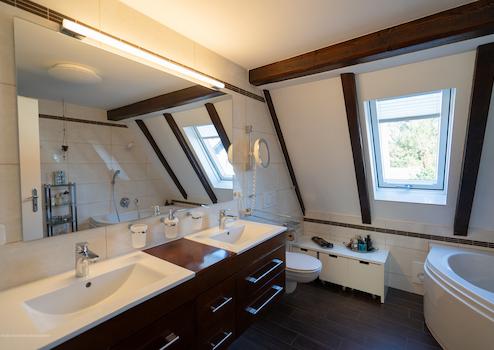 Das Obergeschoss verzaubert mit Echtholzparkett und charmanten Holzbalken, die eine heimelige Atmosphäre schaffen. Das Schlafzimmer bietet einen modernen Dachbalkon, während eines der Kinderzimmer mit einem Bullaugenfenster für Aufsehen sorgt. Das einladende Badezimmer besticht mit einer Eckbadewanne, einer Dusche und zwei Waschbecken.