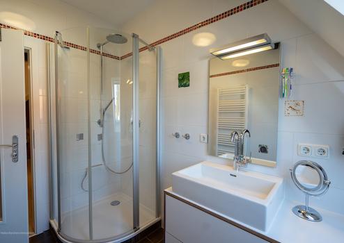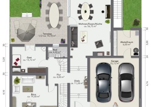 Im Erdgeschoss empfängt Sie eine einladende Diele, die zu einem großzügigen Wohn-Essbereich mit offener Küche (ca. 56,75 m²) führt. Ergänzt wird das Erdgeschoss durch ein Gästezimmer, ein Gäste-Bad, ein Büro und eine praktische Abstellkammer. Die Süd-West-Ausrichtung sorgt für lichtdurchflutete Räume und eine angenehme Atmosphäre. Vom Wohnbereich aus gelangen Sie auf die Terrasse und in den liebevoll angelegten Garten – ein perfekter Ort, um laue Sommerabende zu genießen.