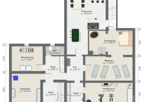 Ein weiteres Highlight ist der Partykeller, ausgestattet mit Bar, Beamer und Leinwand, sowie einem Spiegel für die kleinen Ballerinen. Ein Wellnessraum mit angrenzender Sauna bietet den idealen Rückzugsort für entspannte Stunden. Zusätzlich steht Ihnen ein Hobbyraum zur Verfügung.