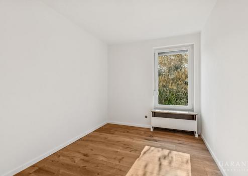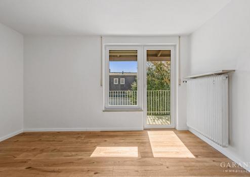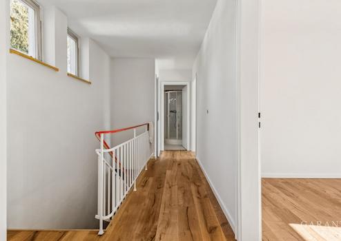 Im Obergeschoss befinden sich drei weitere neu renovierte Zimmer, die flexibel als Schlaf-, Kinder- oder Arbeitszimmer genutzt werden können. Eines der Zimmer verfügt über einen Balkon mit Blick ins Grüne. Ergänzt wird diese Ebene durch ein Duschbad.