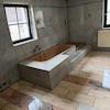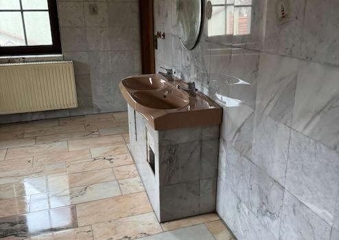 Großes, helles Badezimmer mit Badewanne, Dusche, Fenster