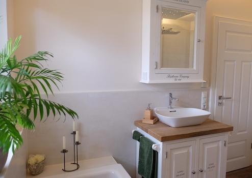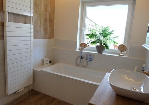 Das Badezimmer mit Badewanne und bodengleicher Dusche verfügt über hochwertige Badmöbel.