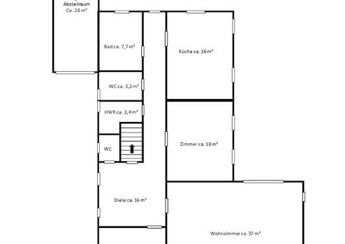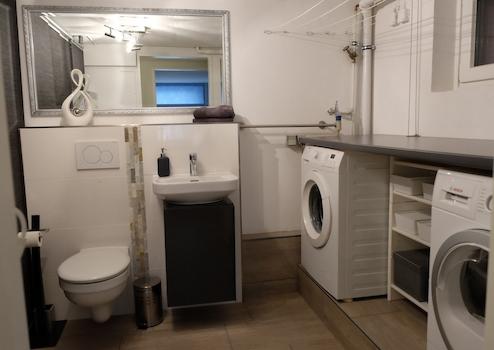 Zum Haus gehören außerdem eine Garage mit Abstellraum, ein Teilkeller mit zu Wohnzwecken geeignetem Gästezimmer; daneben die "Waschküche" mit Waschbecken und WC sowie ein Abstell-/Hobbyraum.