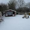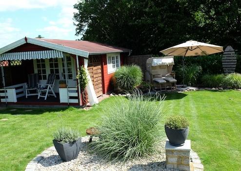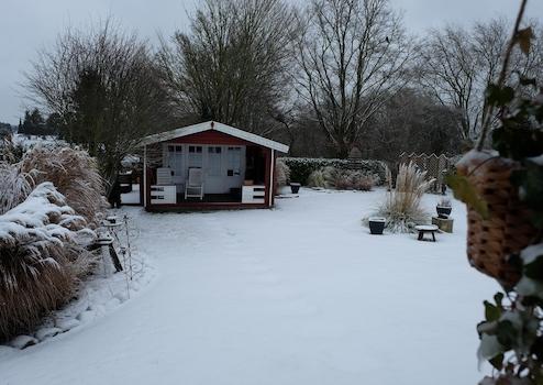 Dort steht das große Gartenhaus mit Holzterrasse für gemütliche Aufenthalte (oder, vielleicht nur im Winter) als zusätzlicher Abstellraum zur Verfügung.