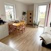 Die Hauptwohnung wird über das Treppenhaus betreten und bildet den klassischen Wohnbereich. Ein großzügiger, heller Wohn-/Essbereich mit Balkonzugang bildet das Herzstück. Die offene Einbauküche ist funktional ausgestattet und verfügt über Spüle, Ober- und Unterschränke, eine Küchentheke als Raumteiler zum Essbereich sowie einen Kühl-/Gefrierschrank. Optional können die neuwertigen Elektrogeräte (Geschirrspülmaschine und Herd mit Backofen) per Abschlagzahlung übernommen werden. Ein Schlafzimmer sowie ein großzügiges Tageslichtbad mit Waschbecken, Badewanne, Dusche und WC ergänzen diese Einheit.