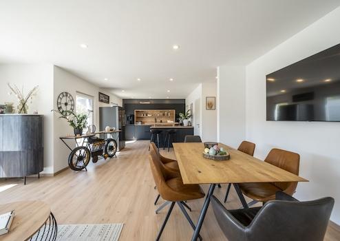 Wohn-/Ess- und Kochbereich angelegt. Die Küche kann mit einer Kochtheke geplant werden.