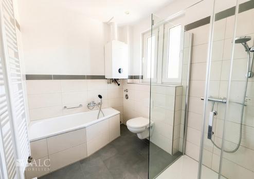 Weiter links erreichen Sie das frisch renovierte Badezimmer, das mit einer Dusche und einer Badewanne ausgestattet ist und somit Entspannung nach einem langen Tag ermöglicht.