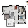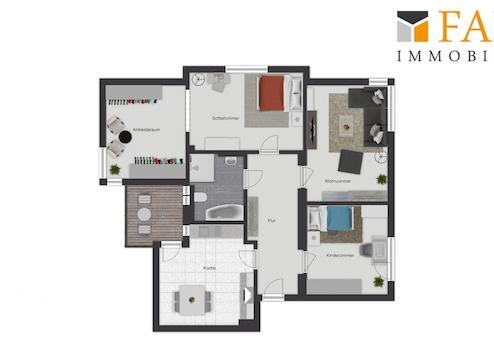 - Grundriss mit Wohnzimmer, Schlafzimmer, Kinderzimmer, Küche, Badezimmer, Flur und Ankleideraum