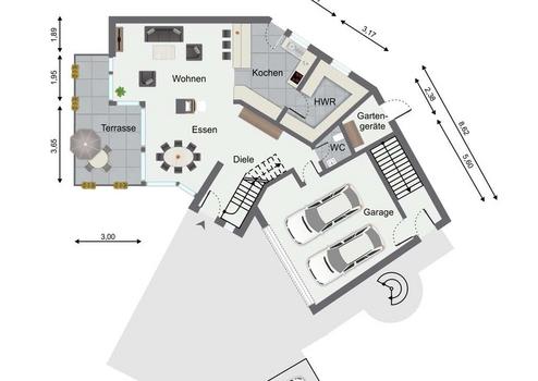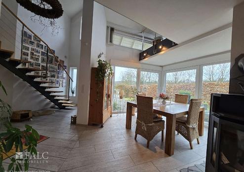 Bereits beim Ankommen überzeugt der stimmige Gesamteindruck: eine ansprechende Außenansicht, ein einladender Eingangsbereich und ein Treppenhaus, das durch die offene Gestaltung und die Galerie ein luftiges Ambiente schafft. Im Erdgeschoss bildet der Wohnbereich das Herzstück des Hauses. Große Fensterflächen sorgen für viel Tageslicht und schaffen eine angenehme Verbindung nach draußen. Der Wohn und Essbereich wirkt offen und kommunikativ, gleichzeitig sind die Bereiche gut zoniert. Ein Kaminofen ergänzt das Wohngefühl und macht den Raum besonders in der kühleren Jahreszeit zu einem gemütlichen Mittelpunkt.