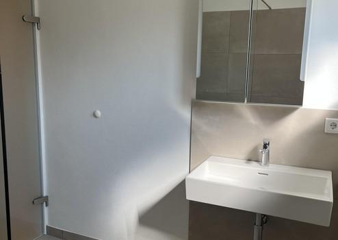 Spiegelschrank sowie Ablagen. Fliegengitter. Neu gefliest.