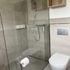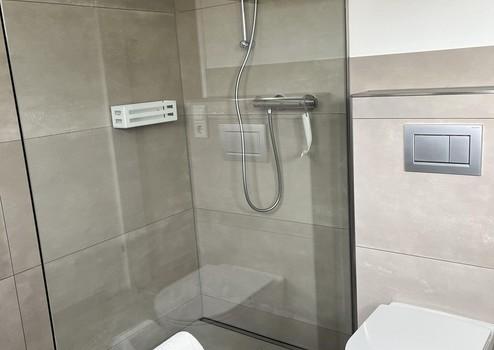 Tageslichtbad mit großer begehbarer Dusche, WC und Waschbecken und großen