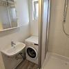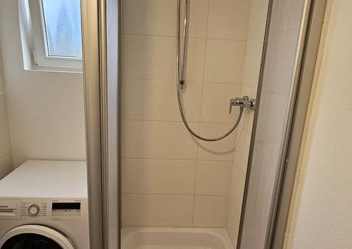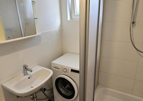 Im Tageslicht-Bad befindet sich eine Dusche, sowie ein Waschbecken und eine Waschmaschine.
