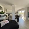 Der Wohn‑, Ess‑ und Küchenbereich ist hell und offen. Große Fenster lassen viel Tageslicht herein, und die Jalousien zum Balkon bieten im Sommer angenehmen Schatten. Die Einbauküche ist von Miele und sehr hochwertig.
