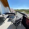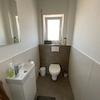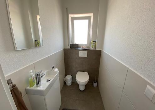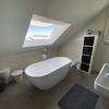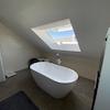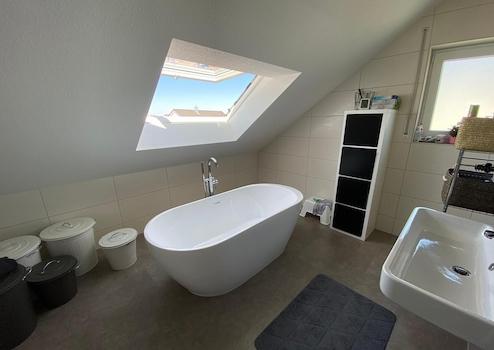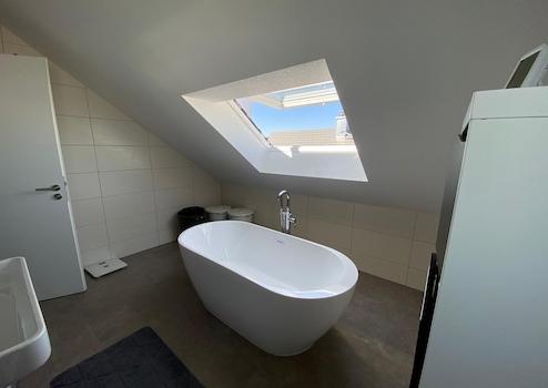 Das Badezimmer hat eine freistehende Badewanne, eine große, geflieste Dusche und ein Dachflächenfenster direkt über der Badewanne. Ein separates Gäste‑WC ist ebenfalls vorhanden.
