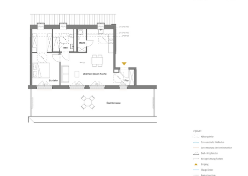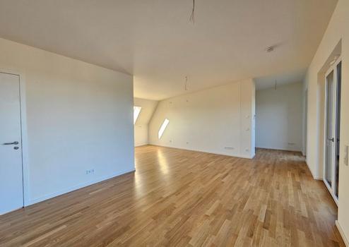 Das Penthouse besteht aus einem großzügigen Wohn- und Essbereich mit Eichen-Echtholzparkett, einem Duschbad, einem Schlafzimmer mit Ankleide oder Arbeitsbereich, sowie einem Hauswirtschaftsraum mit Waschmaschinen- und Elektroanschluss. Das Badezimmer ist in zeitlosem Design gestaltet mit einer hochwertigen Ausstattung von Villeroy & Boch und Hansgrohe.