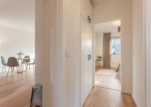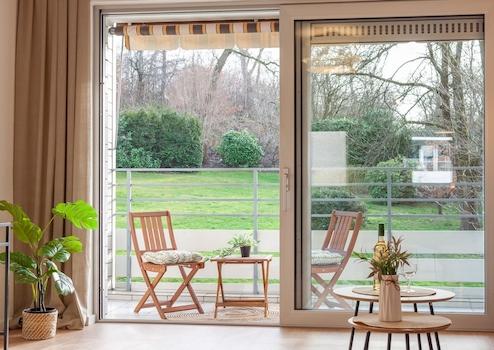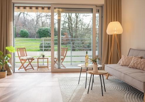 Ein Highlight der Wohnung ist der großzügige Wohn- und Essbereich mit Zugang zum Sonnenbalkon samt Markise. Die große Fensterfront zum Balkon sorgt für eine helle und freundliche Wohnatmosphäre. Das Schlafzimmer sowie das dritte Zimmer, das sich ideal als Kinderzimmer oder Büro nutzen lässt, sind über eine Schiebetür vom Wohnbereich abtrennbar und schaffen dadurch zusätzliche Privatsphäre.