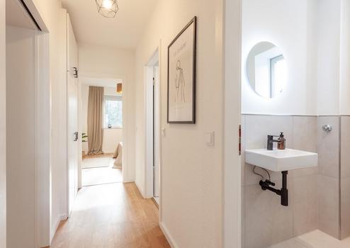 Ergänzt wird das Raumangebot durch ein modernes Tageslichtbad, ein separates Gäste-WC sowie eine praktische Abstellkammer mit Anschlüssen für Waschmaschine und Trockner. Ein Stellplatz vor dem Gebäude kann bei Bedarf angemietet werden.