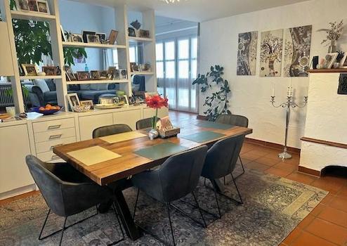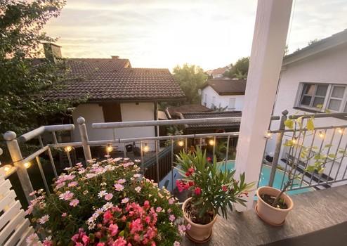 Genießen Sie hier das Frühstück in der Morgensonne. Außerdem gelangen Sie aus dem Wohnzimmer direkt auf den großen, überdachten Süd-Westbalkon mit Blick auf den Pool, wo man herrlich die Abendsonne genießen kann.