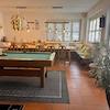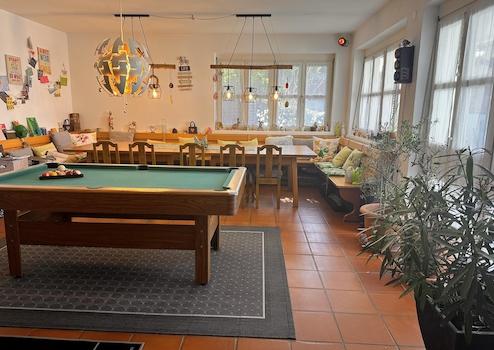 Party-/Hobbyraum mit voll ausgestatteter Küche, Billardtisch, massiver Holzeinbaubank mit Tischen und Stühlen vom Schreiner und Zugang zur Terrasse mit Pool, rund, ca. 4 m Durchmesser, sowie zum Gartenhaus