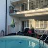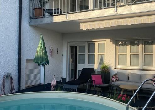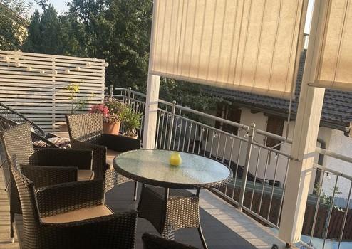 überdachter Süd-West Balkon zum Pool mit Sonnenschutzrollo und Zugang zum Garten