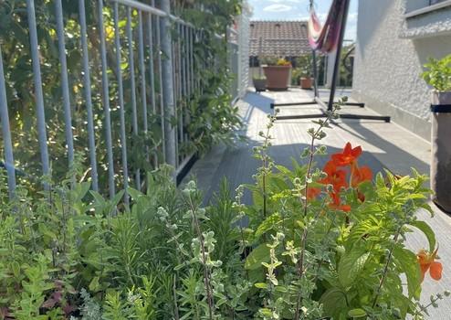 Ost-Terrasse für sonnige Frühstücksmomente und großer Süd-/Westbalkon mit Abendsonne