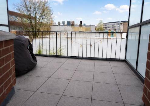 Ein Balkon erweitert den Wohnraum nach außen und bietet einen freien Blick in Richtung der historischen Kulisse der ehemaligen Sauerkrautfabrik – ein urbanes Umfeld mit besonderem Charakter. Das innenliegende Badezimmer ist funktional gestaltet und mit einer Badewanne ausgestattet.