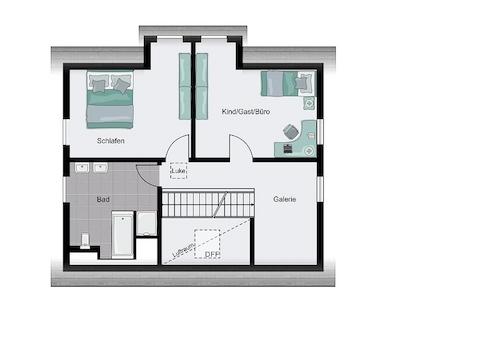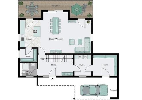 Im Erdgeschoss befindet sich der große Wohn-/Ess- und Kochbereich. Das Gäste-WC wird optional zum Duschbad erweitert und der Hauswirtschafts-/Haustechnikraum komplettiert das Ganze. Im Obergeschoss befinden sich ein ...