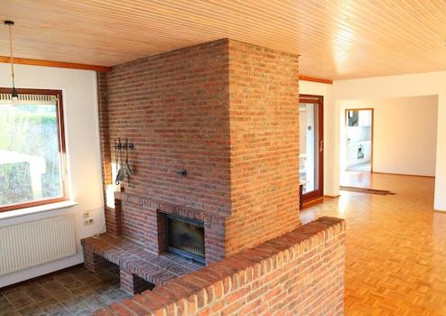 Das Herzstück des Hauses ist das große, lichtdurchflutete Wohnzimmer mit Parkettboden und integriertem Kaminzimmer - ein stilvoller Mittelpunkt für Familie und Gäste. Sowohl ein Innen- als auch ein Außenkamin sorgen für eine besondere Wohnatmosphäre zu jeder Jahreszeit und unterstreichen den behaglichen Charakter des Hauses.