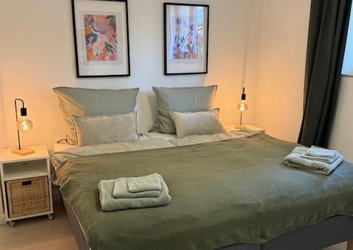 Die Wohnung verfügt über ein gemütliches Schlafzimmer, das flexibel mit zwei Einzelbetten oder einem Doppelbett genutzt werden kann. Das helle Wohnzimmer lädt zum Entspannen ein und bietet zusätzlich ein ausziehbares Schlafsofa, das Platz für bis zu zwei weitere Personen bietet. Somit eignet sich die Wohnung ideal für Paare, Geschäftsreisende oder kleine Familien.