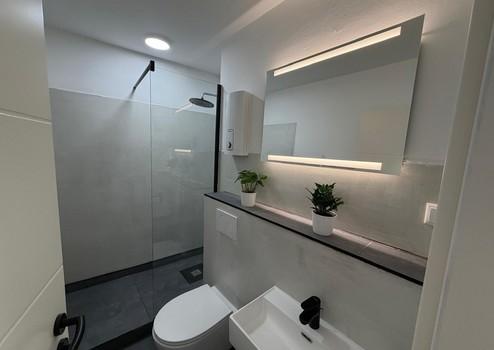Bodenbeläge: Hochwertiger Vinylboden in Wohn- und Schlafbereich, moderne Fliesen im Bad und Spachteltechnik