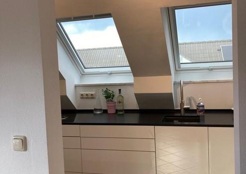Rarität, Licht durchgeflutete 3 Zimmer, Dachgeschosswohnung, ca. 66 qm. Vom Flur aus gelangen sie ins Wohnzimmer mit offener Küche, Naturstein Arbeitsflächen, Bora Dunstabzug, Qooker Wasserspender, Siemens Herd und Geschirrspüler.