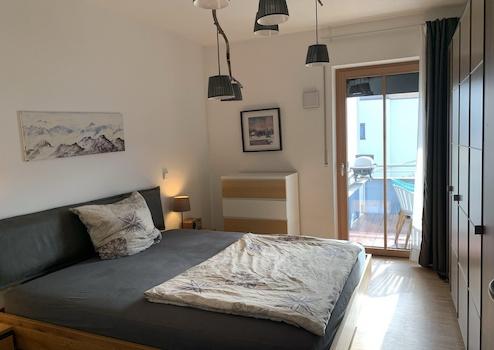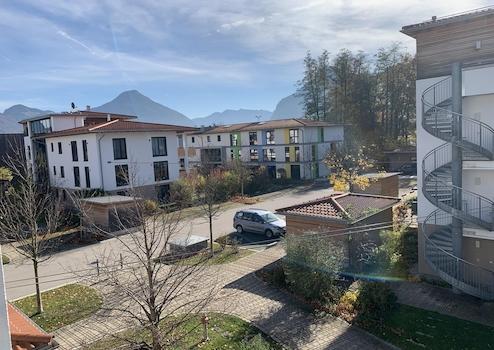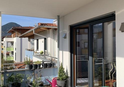 Der großzügige Balkon mit südlicher Ausrichtung ermöglicht den Blick in das schön gestaltete Umfeld der Anlage, sowie einen traumhaften Fernblick in das nahe und ferne Bergpanorama bis hin zum Kaisergebirge und dem Wendelstein.