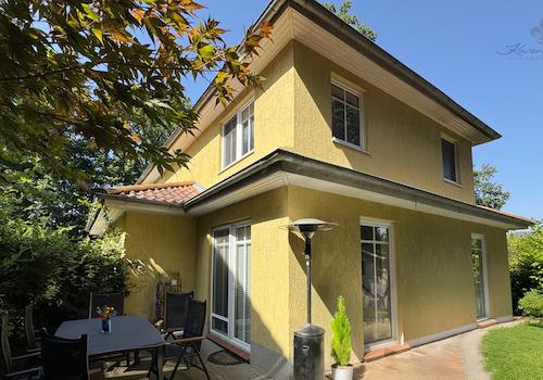 Umgeben von altem Baumbestand und gepflegten Grünflächen eröffnet sich hier eine Wohlfühloase, die zu jeder Jahreszeit begeistert. Die weitläufige Rasenfläche bietet viel Platz zum Entspannen, Spielen oder für gesellige Stunden im Freien.