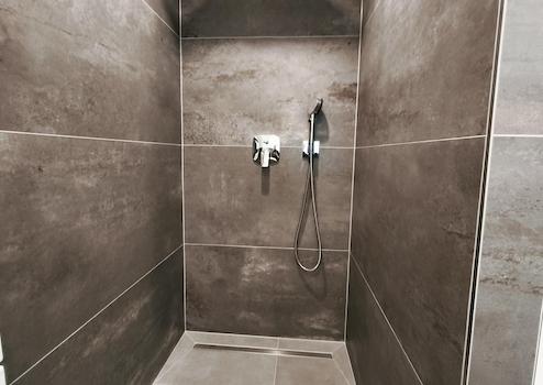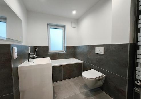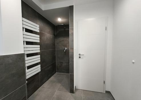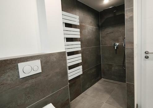 - Hochwertig gefliestes Bad mit Badewanne und großzügiger Dusche