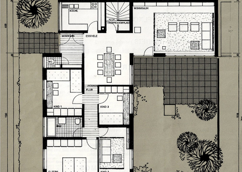 Vom Windfang aus gelangen Sie in die offene Essdiele. Dieser zentrale, helle Bereich ist der Dreh- und Angelpunkt des Hauses, ideal für gemeinsame Mahlzeiten und als Treffpunkt der Familie. Hier befindet sich auch die Treppe, die hinunter in den Keller führt.